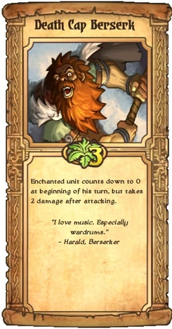 | 0.77 alpha | November 19, 2012 | Its effect was rephrased. | Enchanted unit's Countdown is set to 0 at beginning of his turn, but recieves 2 damage after attacking. | Enchanted creature's Countdown is set to 0 when Death Cap Berserk is played. At beginning of creature's turn Countdown is set to 0 and creature is dealt 2 damage. |
